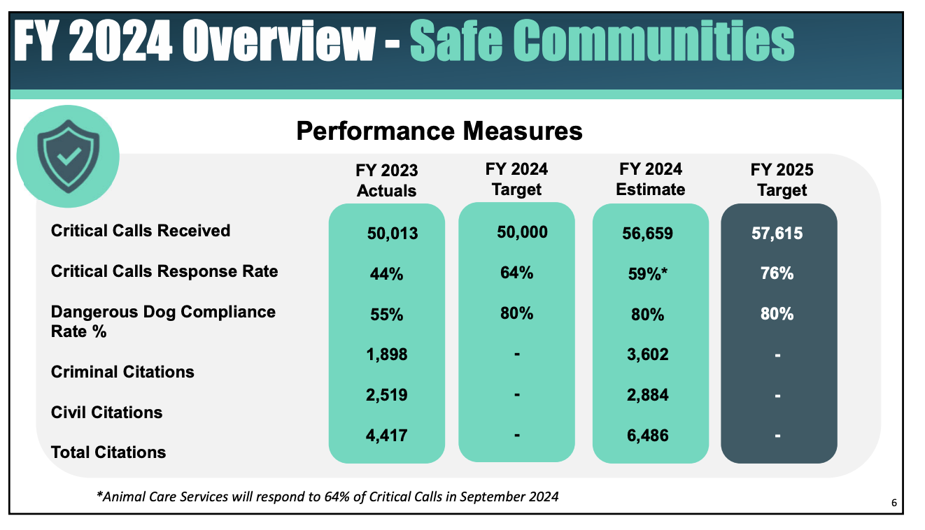 San Antonio’s Animal Care Services Department still is not responding to roughly 40% of the critical calls it receives, is not on track to reclaim its “no kill” status and is falling well short of its spay/neuter goals one year after a deadly dog mauling spurred a major budget increase, according to a city budget presentation Tuesday.