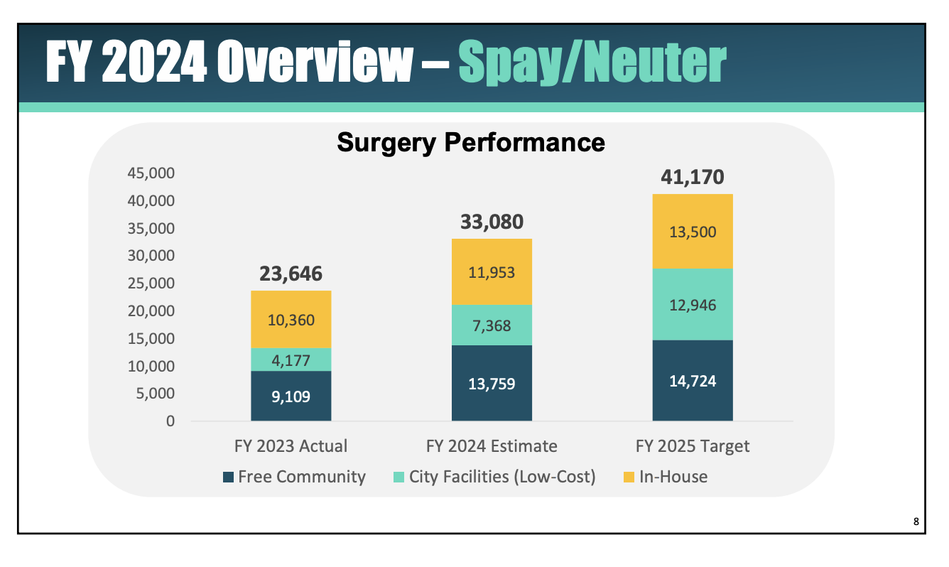 Tuesday’s presentation indicated that ACS is on track to fall short of its spay/neuter goals by roughly 10,000 surgeries this year.