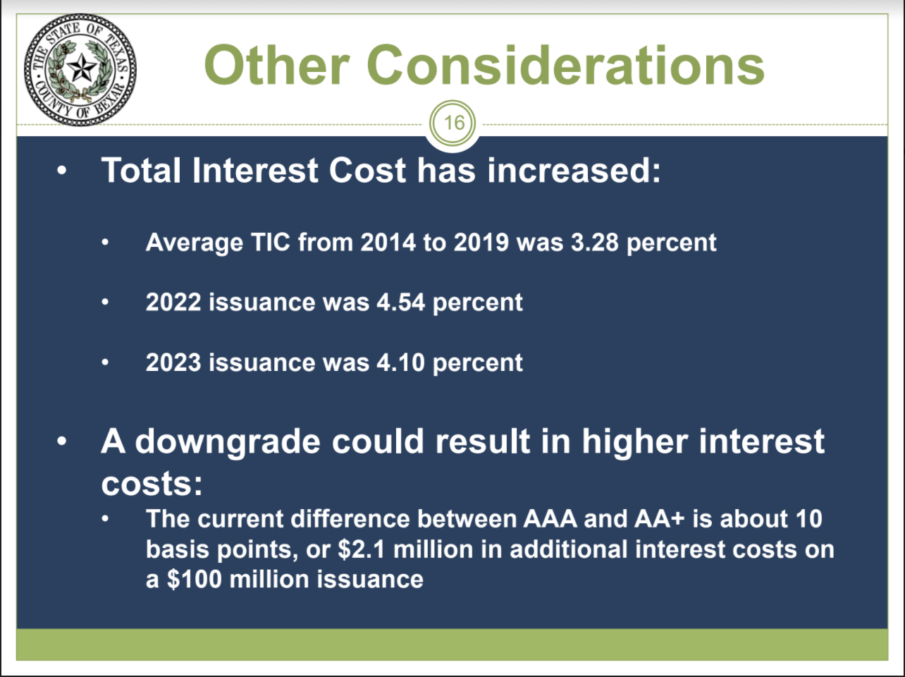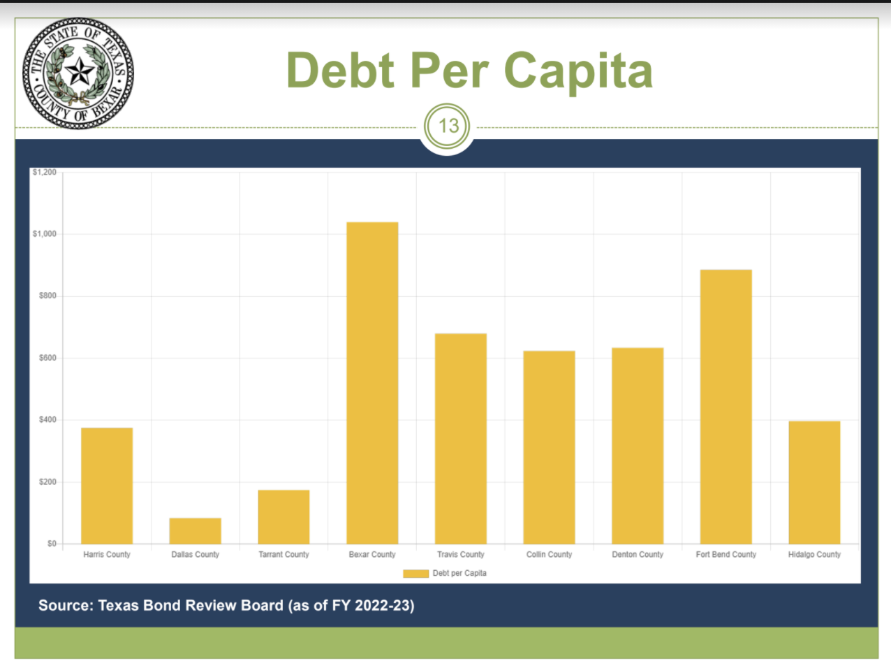 The county’s roughly $2.5 billion in outstanding debt means it has the highest debt per capita among Texas counties — something County Manager David Smith said ratings agencies have recently started caring more about, despite otherwise favorable ratings factors.