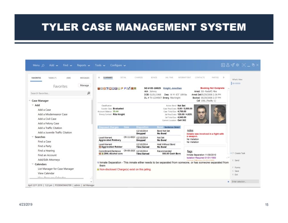 O’Mahoney showed Tuesday that Bexar County’s current technology is fairly outdated. He highlighted a new content management system for court cases, comparing the current system that Bexar County used with a page designed by Tyler Technologies. The current system uses code words and is just text on a black screen, while the updated system uses drop-down menus, photographs, and case overviews.