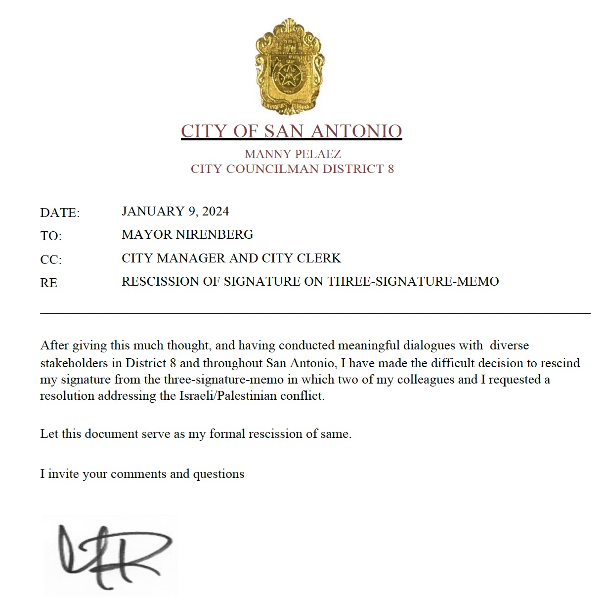 Plans for a special meeting of the San Antonio City Council to consider a resolution calling for a cease-fire in Israel’s war with the Palestinian militant group Hamas have been canceled following Councilman Manny Pelaez’s withdrawal of his request for the meeting.