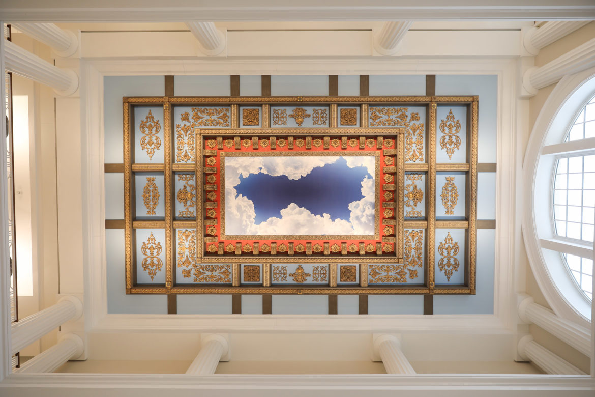 Past that point and through a set of double doors with a Roman grille and rosette medallions is the Great Hall, a light-filled, three-story vestibule with a grand travertine stairway. The third floor of this administrative and classroom building has views of the nearby quarries. On the ceiling is a celestial scene framed in gold-look filigree.