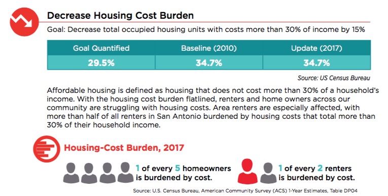 The SA2020 goal to decrease housing-cost burden indicated progress in 2017 (based on 2015 data) when 34.2 percent of housing units cost more than 30 percent of the residents’ income. In the report released Tuesday, that percentage increased slightly to 34.7 percent (based on 2017 data). The goal is 29.5 percent.