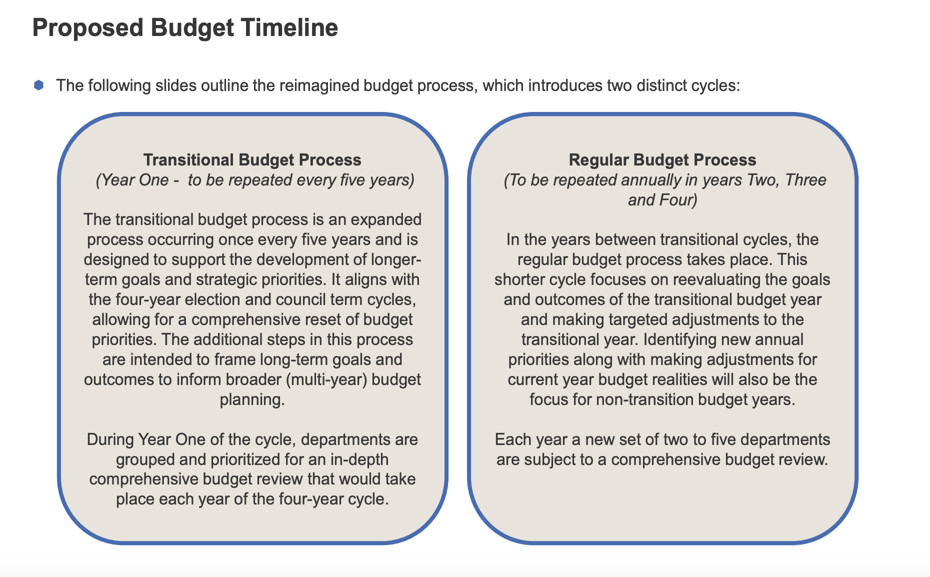 They would then spend nearly the entire next year working on an “in-depth comprehensive budget review” — a process that would repeat in 2030, after the next city election in 2029.