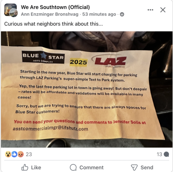 A flyer that’s been attracting comments on the “We Are Southtown” Facebook group said Blue Star plans to use LAZ Parking’s text-to-pay system starting sometime in 2025.