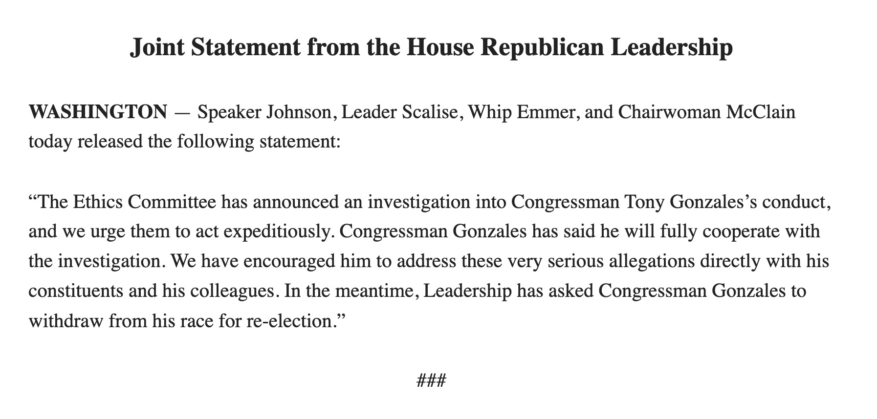 The Texas Tribune reported earlier on Thursday that GOP leadership said they had urged the House Ethics Committee, a congressional watchdog, to “act expeditiously” and that Gonzales “said he will fully cooperate with the investigation.” House rules prohibit members from having a sexual relationship or engaging in unwelcome sexual advances with their staffers.